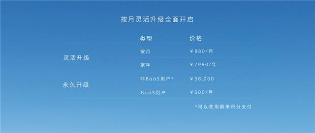 根据蔚来用户100kWh的电池升级方案,按月灵活升级的价格为880元/月。BaaS与非BaaS用户均可享受按月灵活升级,且升级方式和收费标准相同。不过,BaaS用户在980元/月的租金外,需要额外再支付880元/月的按月灵活升级费用。