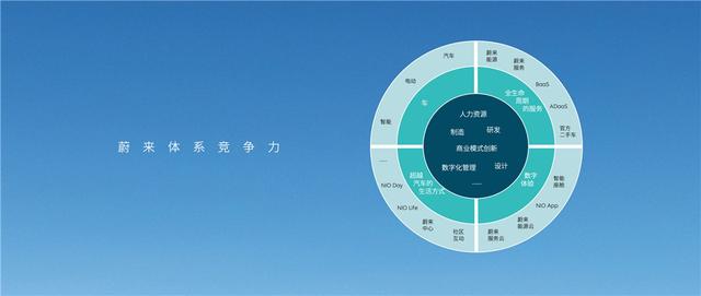 外部第一圈,则被分为四部分,即车、全生命周期的服务、数字体验、超越汽车周期的生活方式。而继续延展的外部第二圈,则包括了智能、电动、汽车,蔚来能源、蔚来服务、BaaS、ADaaS、官方二手车,智能座舱、NIO App、蔚来能源云、蔚来服务云,NIO Day、NIO life、蔚来中心、社区互动等等载体。